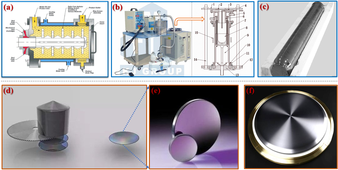 圖2 (a) 球磨示意圖;(b) 熔煉鑄造爐及其熔煉機(jī)理示意圖;(c) 制備的多晶棒的實(shí)物圖 (表面光亮呈現(xiàn)鏡面反光);(d) 晶錠切片示意圖;(e) 經(jīng)過(guò)打磨、拋光后的靶材;(f) 綁定銅背板后的靶材成品。