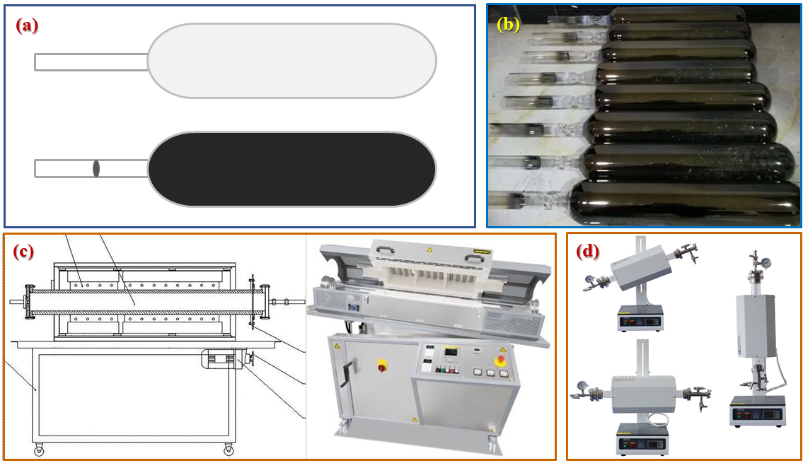 圖1 (a) 石英管涂碳和液氧燒結(jié)的示意圖;(b) 投料后的涂碳石英管實(shí)拍圖; (c) 可旋轉(zhuǎn)高溫反應(yīng)爐的示意圖和實(shí)物圖; (d) 調(diào)節(jié)不同角度的高溫反應(yīng)爐。